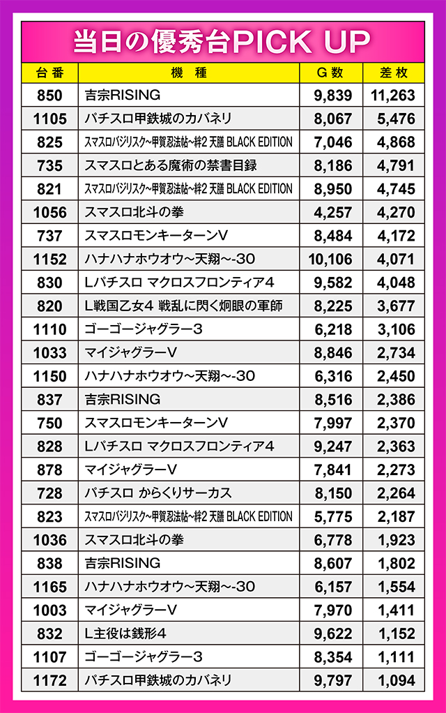 『吉宗RISING』が11,000オーバーをブッ放し、圧倒的な存在感を見せつけた。2位の『パチスロ甲鉄城のカバネリ』の記録が5,000枚超えだったことからも、いかにこの記録が凄まじいものか伝わるはず。特筆すべきは、『ハナハナホウオウ~天翔~-30』や『ジャグラー』シリーズなどの比較的おとなしめの機種からも好結果が生まれていたことだ。