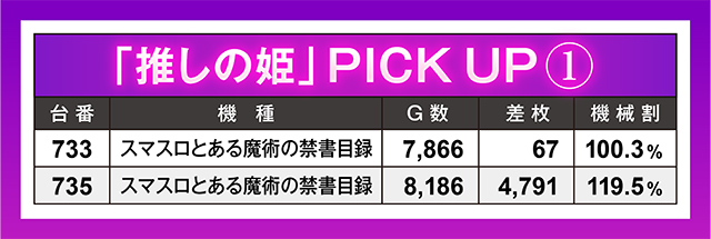 2台設置の『スマスロとある魔術の禁書目録』は2台ともがプラスに。733番台はギリギリのプラスだったものの、735番台がその鬱憤を晴らすかのように5,000枚近い記録を叩き出してくれた。