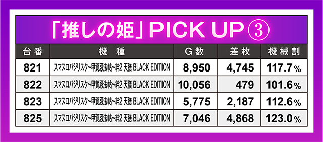 4台が設置されている『スマスロバジリスク~甲賀忍法帖~絆2 天膳 BLACK EDITION』も4台ともから優秀台挙動が見て取れた。4台ともがしっかりプラっていたのがその証拠。