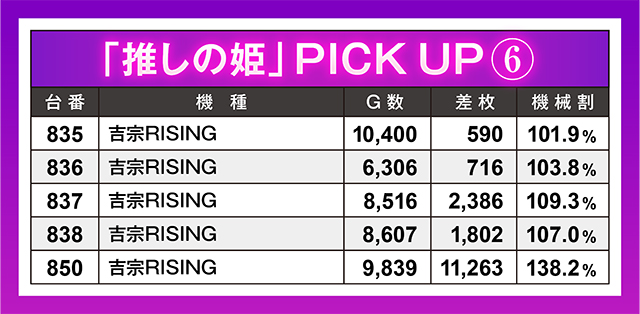 総合ランキング1位記録も飛び出した『吉宗RISING』は、設置の5台すべてがプラスという結果に。やはり5台ともが優秀台だったと見るのが妥当だろう。