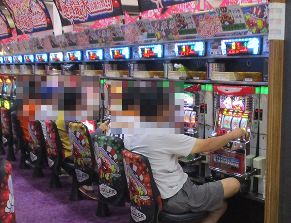 午後のパチスロで、もっとも目立っていたのがジャグラーシリーズ。多くのプレイヤーが笑みを浮かべて遊技を楽しんでおり、シンプルな告知を味わえているようにみえた。
