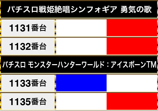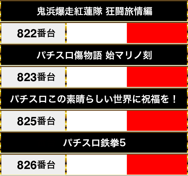 822番台の『鬼浜爆走紅蓮隊 狂闘旅情編』から826番台の『パチスロ鉄拳5』までに広がっている華やかな光景も魅力的に映った。