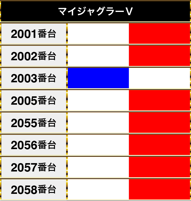 パチスロをみると、『マイジャグラーⅤ』の2001番台から2005番台までに楽しげな光景が広がっていた。