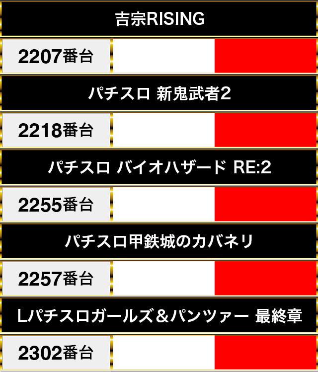 『パチスロ 新鬼武者2』の2218番台や『パチスロ バイオハザード RE:2』の2255番台などもプラスptとなった。
