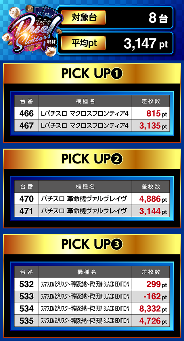 「Lパチスロ マクロスフロンティア4」も設置されている2台がプラスとなり、467番台は3,100pt以上となった。