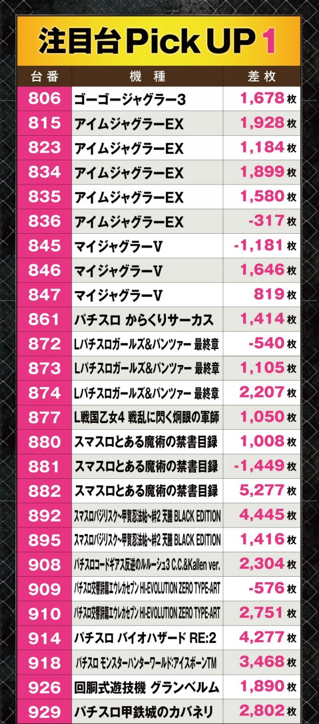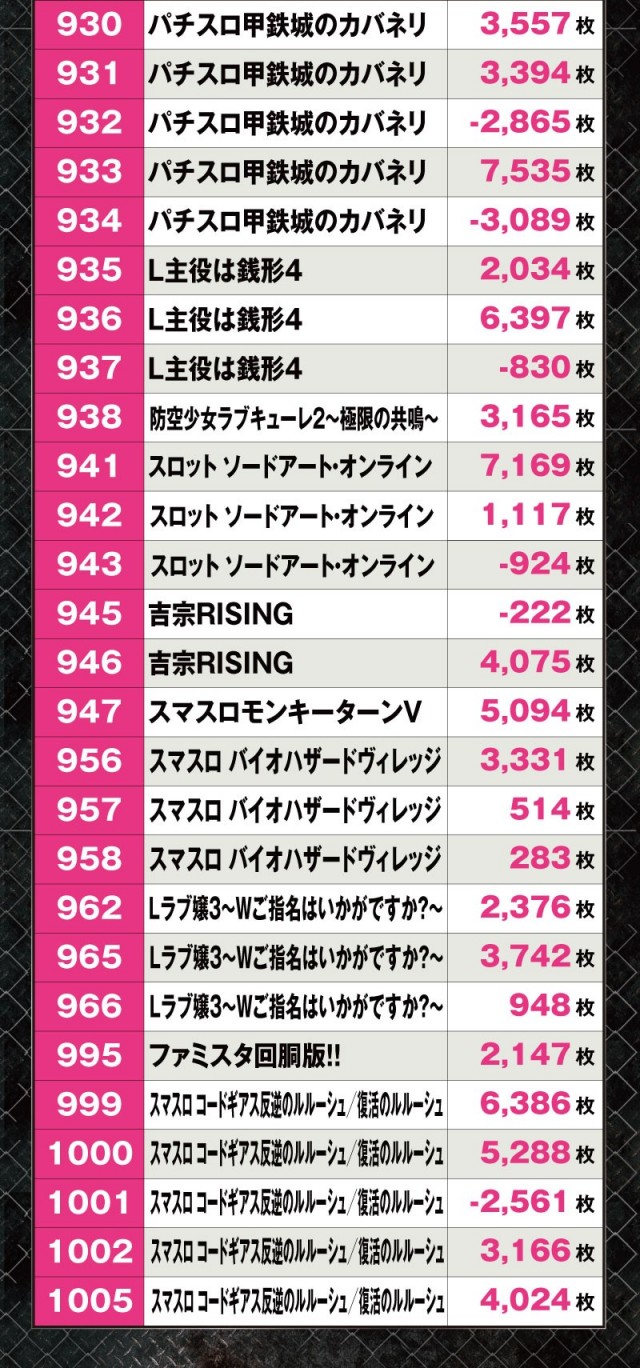次に並びを見てみよう。全台系箇所を含む並びが計10か所以上誕生し、そこかしこに華やかな光景が広がっていた。特に『スマスロ コードギアス反逆のルルーシュ/復活のルルーシュ』は4台並びで平均+3,070枚と圧巻のパフォーマンスを披露していた。