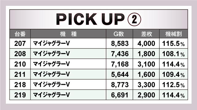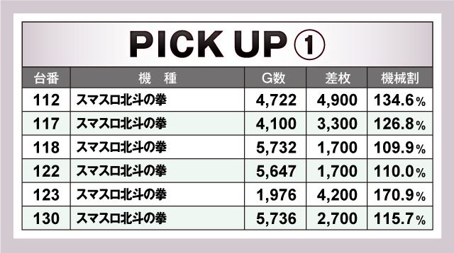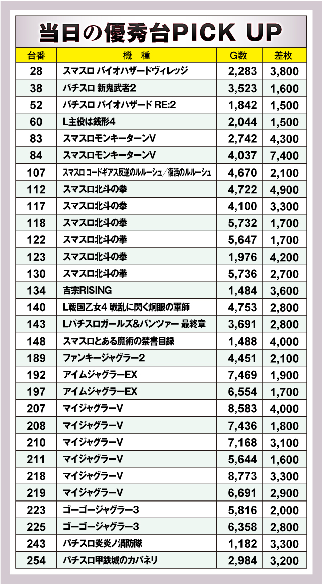 続いては、当日とくに活躍していた2機種を紹介していこう。まずスマスロを代表して「スマスロ北斗の拳」をピックアップ。6台すべてが優秀台に選出されており、112番台の+4,900枚を筆頭に好記録が続出! またジャグラーシリーズ代表の「マイジャグラーⅤ」は、差枚+3,000枚クラスの3台をはじめ、好記録台が出現! もちろんこれら2機種以外にも、賑わう機種は複数確認できた!