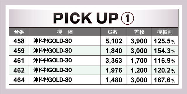 続いては、当日とくに店内を盛り上げた3機種を紹介していこう。まず優秀台ピックアップ30台に5台がランクインした「沖ドキ!GOLD-30」は、並びではないもののカタマリで好記録が複数出現! 続いて、現行機のなかでも注目度が高い「パチスロ 革命機ヴァルヴレイヴ」のピックアップ4台は万枚オーバー等の目立った記録はないものの、ピックアップ4台のうち3台が+5,000枚オーバーの好記録をマーク! そして最優秀台を獲得した「スマスロモンキーターンV」は、ピックアップ3台平均差枚+5,667枚と圧倒的記録を残していた!