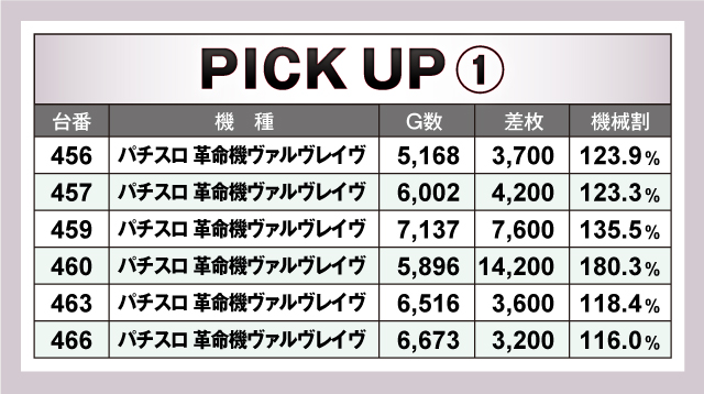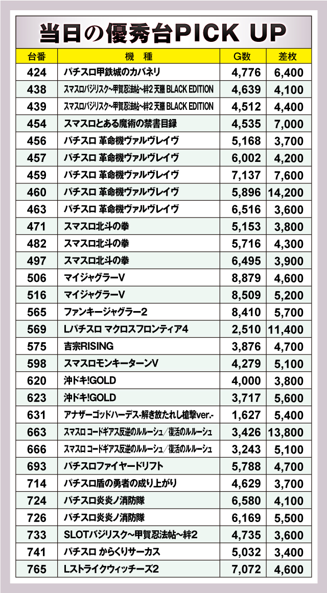 まずは優秀台30台をチェックしていこう。なんと30台すべてが+3,000枚オーバーで、+5,000枚オーバーは13台出現! それらのなかでもっとも優秀だったのは、460番台の「パチスロ 革命機ヴァルヴレイヴ」で、差枚+14,200枚と圧倒的プラスを獲得! 優秀台30台を見渡すと、最優秀台の「パチスロ 革命機ヴァルヴレイヴ」を筆頭に人気のスマスロが大活躍で、その他ジャグラーシリーズや「沖ドキ!GOLD」などの6.5号機が多数ランクイン。また、導入間もない新台たちが複数ランクインしていたこともあり、ファンから注目を集める機種たちに注力していたことが窺えた!