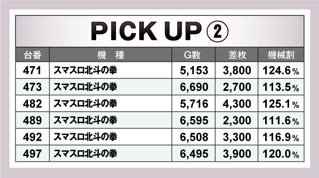 続いては、当日とくに賑わっていた3機種を紹介していこう。まずは最優秀台も獲得した「パチスロ 革命機ヴァルヴレイヴ」は、460番台の+14,200枚のほか、ピックアップ6台すべてが+3,000枚以上と絶好調。次に「スマスロ北斗の拳」は、+10,000枚クラスの好記録はなかったものの、アベレージの高い差枚数が続出していた。そしてノーマルタイプのなかでもっとも活躍していた「マイジャグラーⅤ」は、516番台の差枚+5,200枚を筆頭に+2,000枚オーバーが続出! これら3機種の賑わいが当日の盛り上がりを牽引していたのは間違いなさそうだ!
