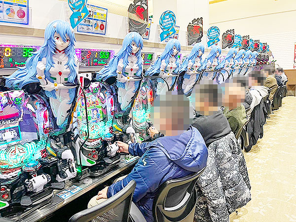 15時半ごろの4円パチンコを見渡すと「ぱちんこ シン・エヴァンゲリオン Type レイ」や「e Re:ゼロから始める異世界生活 season2」が高稼働。プレイヤーの活躍を各所で目撃している。