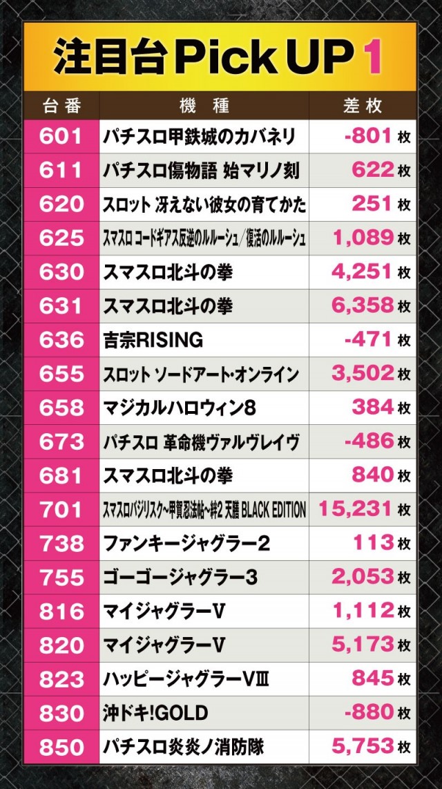 店内状況はというと、満遍なく至る所で好調台が誕生していた。なかでも『スマスロバジリスク~甲賀忍法帖~絆2 天膳 BLACK EDITION』では+15,231枚という圧巻のパフォーマンスを披露している。前回に引き続き同機種がNo.1の好調台だった!