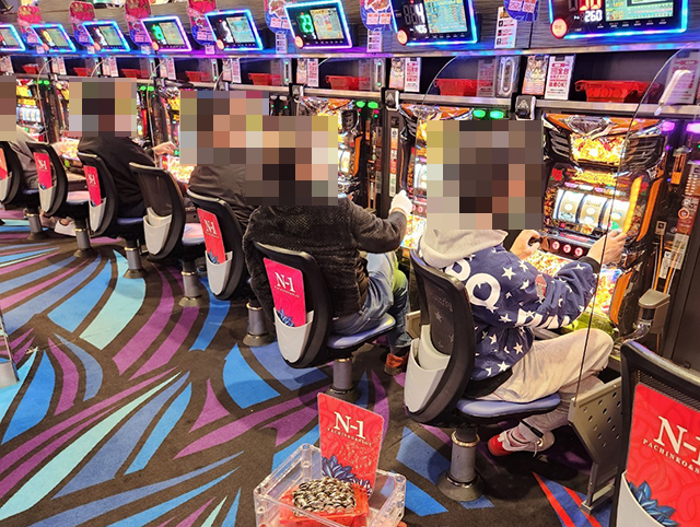 明るい表情のプレイヤーが多く、5箱や4箱の持ち玉を使って遊技をおこなう姿もあった。