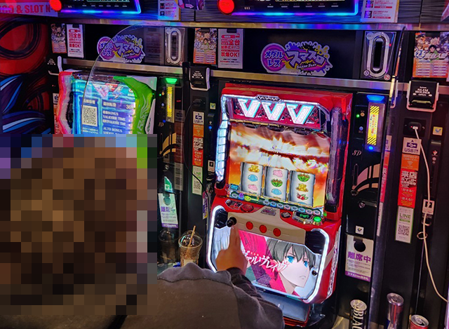 うれしそうに遊技をおこなうプレイヤーは「パチスロ 革命機ヴァルヴレイヴ」でもみられ、5,000pt以上を記録している台もあった。