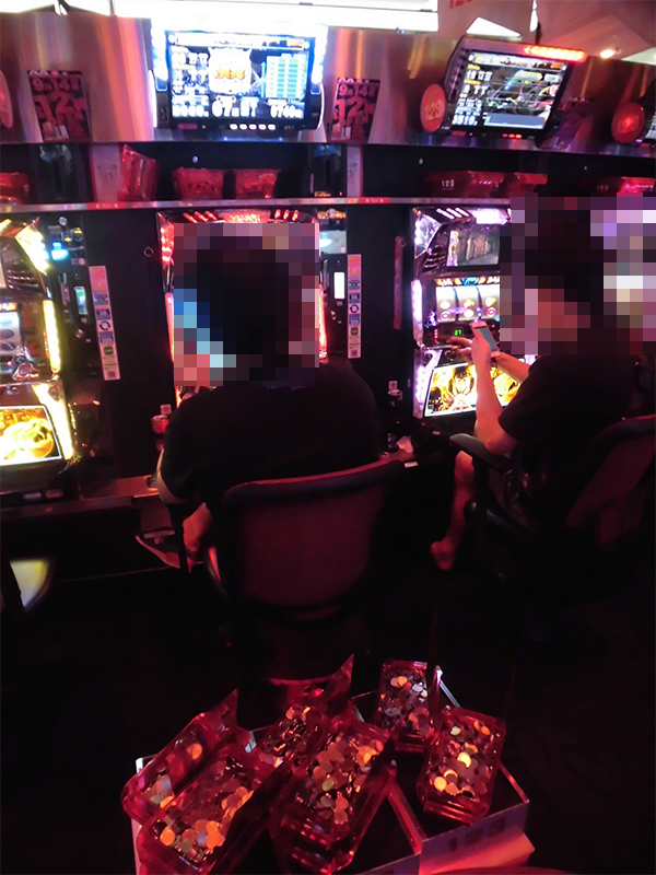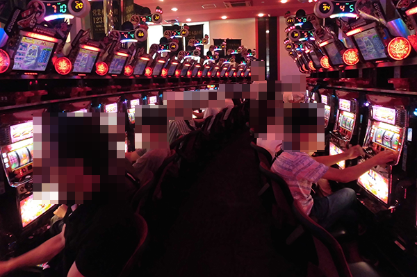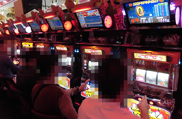 午後の20円パチスロをみてみると、「バジリスク~甲賀忍法帖~絆」が大盛況。あちこちに華麗なパフォーマンスを披露するプレイヤーがみられ、楽しげな空間となっていた。