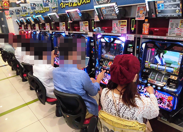 午後になっても、20円パチスロの「バジリスク~甲賀忍法帖~絆」やハナハナシリーズが楽しまれており、プレイヤーは笑顔。