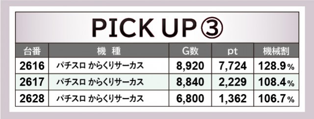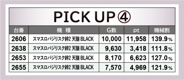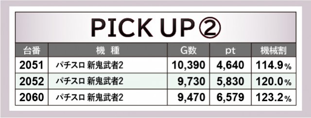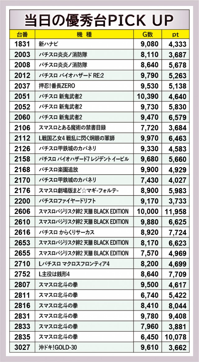 数多の機種から大台突破台が発生していたわけだが、『パチスロ バイオハザード RE:2』『パチスロ 新鬼武者2』『パチスロ からくりサーカス』『スマスロバジリスク~甲賀忍法帖~絆2 天膳 BLACK EDITION』は回転数とptが比例した展開となっていた。大きな活気と熱気を形成し、その中で万pt OVERのほか、2616番台+7,724ptや2653番台+6,623ptといった好記録が生まれている。