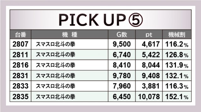 圧倒的人気を誇る『スマスロ北斗の拳』は回転数も然ることながら、多くの台で大台を突破していたのが目に焼きつく。その中で2835番台+10,078枚と万枚OVERが発生し、島の熱気を一気に引き上げてくれた。8~9千枚OVERを記録する台もあり、遊技していたファンは自信を持ってレバーを叩けていたことだろう。