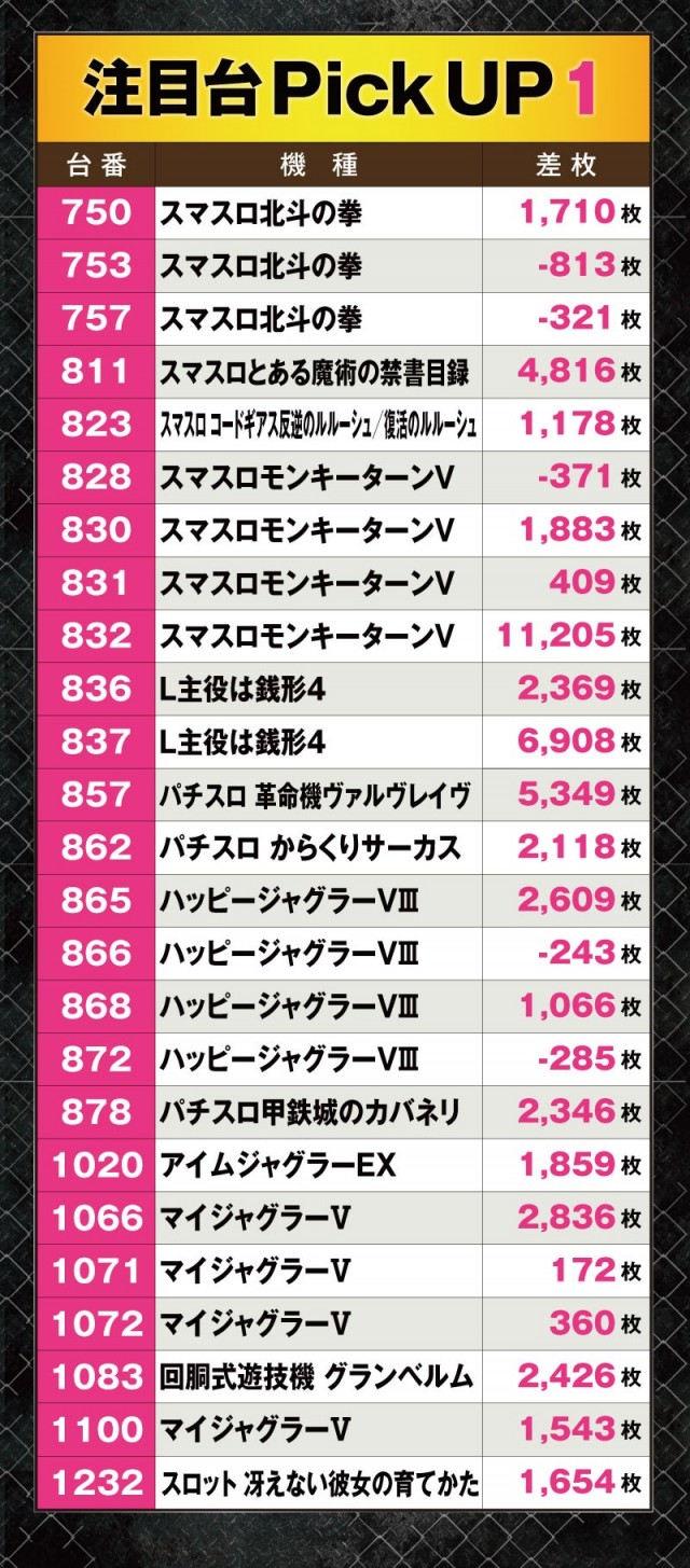 まず『スマスロモンキーターンV』が全台系となっており、なかでも832番台は+11,205枚という素晴らしい差枚を記録している!