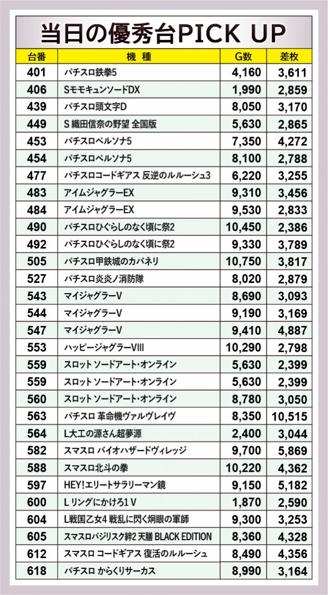 優秀台をチェックすると、『パチスロ 革命機ヴァルヴレイヴ』563番台+10,515枚という大きな熱量が真っ先に飛び込み、4台の万回転OVER達成台の存在感も見逃せない。多くが8~9千回転台をマークしており、各台で熱気が放たれていたのも頷ける数字だ。また全体的に3千枚OVERが目立っており、ファンは有意義な時間を過ごせたのではないだろうか。