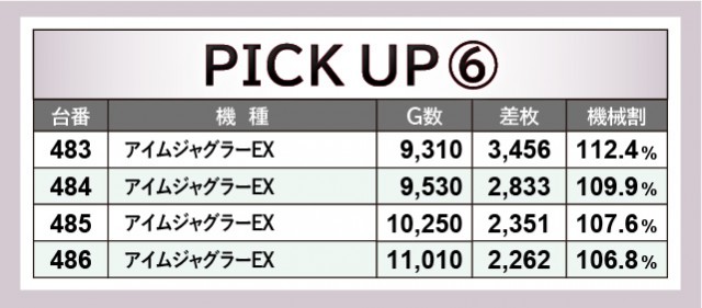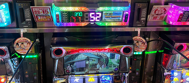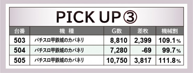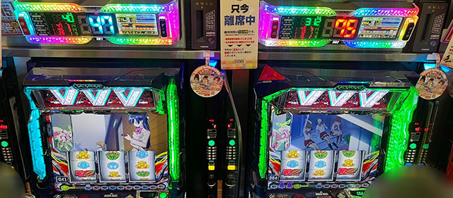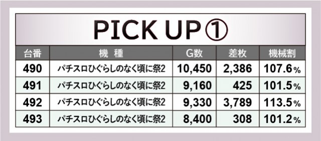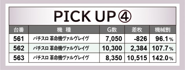 『パチスロひぐらしのなく頃に祭2』がピックアップされるのは同店としては珍しくなく、今回も492番台+3,789枚といった大きな熱気を放っていた。ほかにも『パチスロペルソナ5』453番台+4,272枚や『パチスロ甲鉄城のカバネリ』505番台+3,817枚、極めつけは『パチスロ 革命機ヴァルヴレイヴ』563番台+10,515枚で、各台とも大きく盛り上がっていたのは間違いない。
