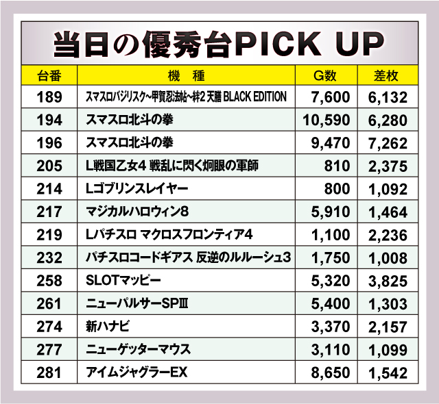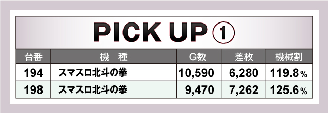 まずは優秀台のチェックから。今回は13台の優秀台のうち+2,000枚オーバーは7台で、+5,000枚オーバーは3台出現。それらのなかでもっとも優秀だったのは、196番台の「スマスロ北斗の拳」で、差枚+7,262枚を獲得! 全体を見渡してみると、やはり前回同様スマスロの活躍が目立つなか、ノーマルタイプが複数ランクイン。前日とは違い「ニューパルサーSPⅢ」「ニューゲッターマウス」といった機種もランクインしていたので、ノーマル好きの人も満足できる内容だったようだ!