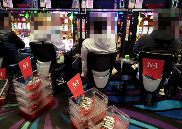 プレイヤーたちは笑顔で遊技をおこなっており、5箱や4箱の持ち玉を確認。