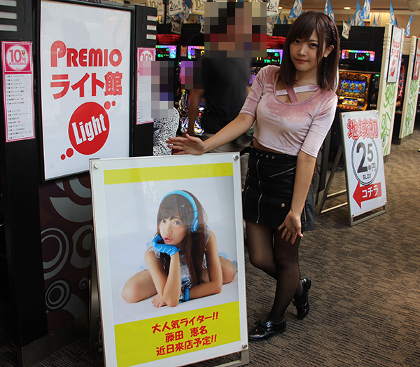 取材日はプレミオグループの大挑戦として、藤田恵名さんが来店。プレイヤーたちと笑顔でコミュニケーションをとり、ホール内の雰囲気を明るいものにしていた。