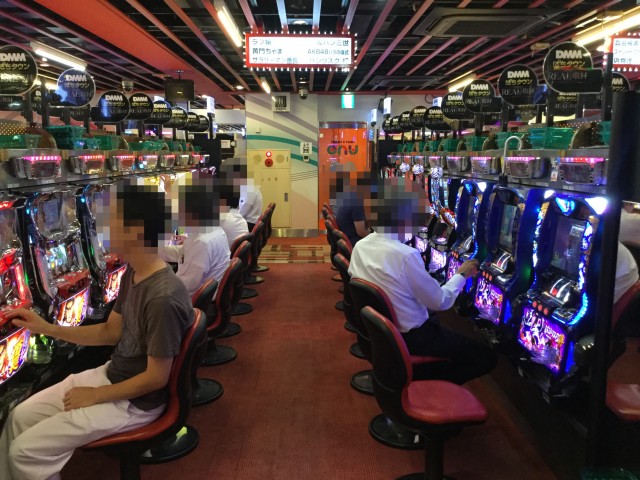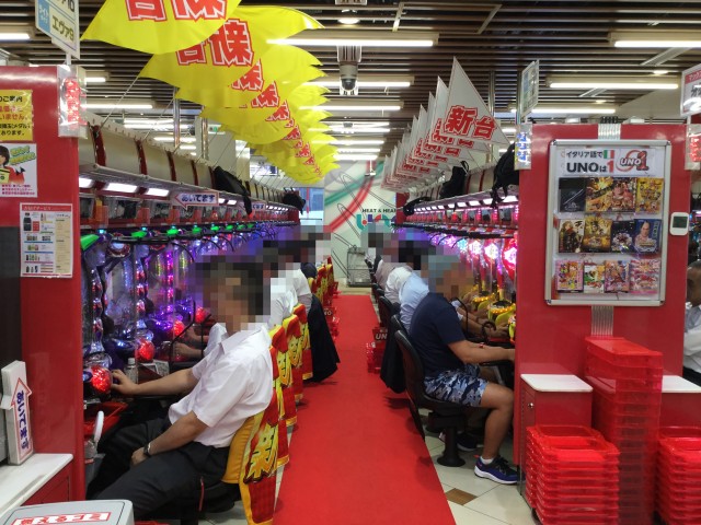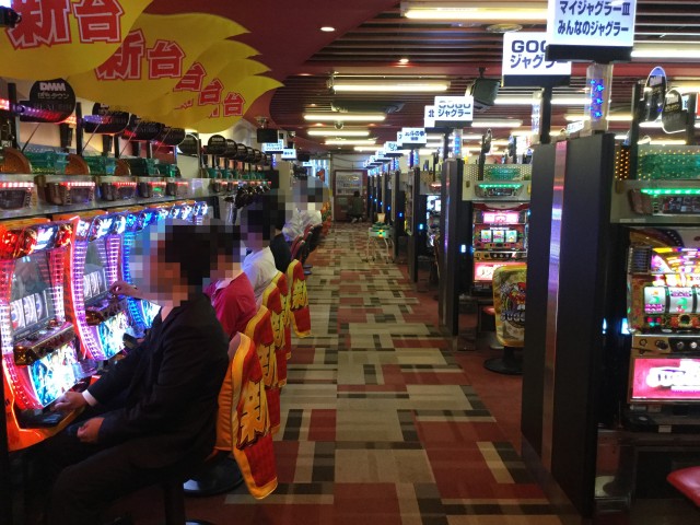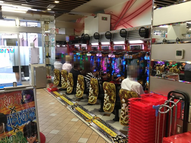 店内に入るとまずパチンココーナーが目に入り、「CRヱヴァンゲリヲン9」や「CR牙狼 魔戒ノ花」に人気が集中した。満面の笑顔を見せるプレイヤーの姿も多々確認できた。