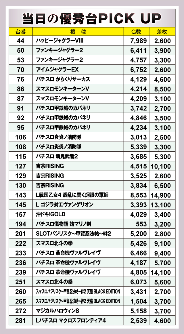 まずは優秀台30台のチェックから。30台全てが+2,000枚オーバーで、+5,000枚オーバーは30台のうち11台。それらのなかでもっとも優秀だったのは、143番台の「L戦国乙女4 戦乱に閃く炯眼の軍師」で、差枚+14,900枚の圧倒的プラスを獲得! その他+10,000枚オーバーは4台出現しており、これだけ見ても当日どれ程盛り上がっていたかが分かってもらえるハズ。また、ランクインしていた機種は大半がスマスロではあったが、ジャグラーシリーズも複数ランクインしていたので、幅広い機種にチャンスがあったようだ!