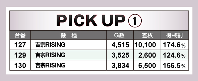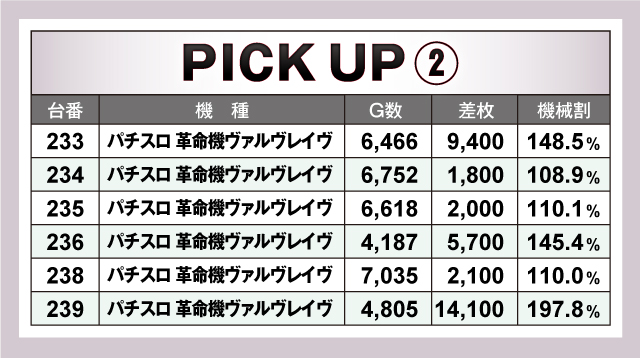 続いては、当日とくに賑わっていた2機種を紹介。まず「吉宗RISING」は、127番台の+10,100枚を筆頭に4ケタオーバーの好記録が出現! そして「パチスロ 革命機ヴァルヴレイヴ」は、惜しくも最優秀台を逃した238番台の+14,100枚を筆頭に超記録がザクザク! これだけしっかり結果が出ていたということは、これら2機種には固まりで好環境だったことは間違いなさそうだ!
