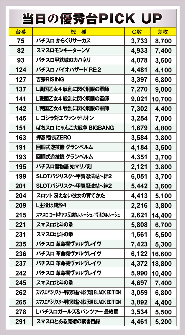 まず初めに、優秀台30台を見ていこう。なんと30台すべてが+3,000枚以上で、+5,000枚オーバーは18台。さらに大台の+10,000枚オーバーが驚異の5台出現! それらのなかでもっとも優秀だったのは、237番台の「パチスロ 革命機ヴァルヴレイヴ」で、差枚+18,800枚!! ランクイン機種を見渡すとやはりスマスロが大半を占めており、その他6.5号機はもちろん、「押忍!番長ZERO」などの6号機からも複数台がランクインしていた!