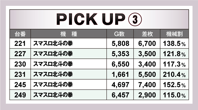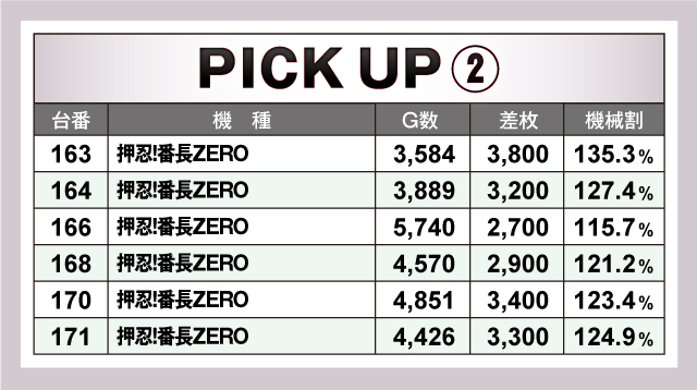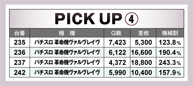 続いては、賑わう店内の中でも一際目立って盛り上がっていた4機種を紹介していこう。すべての機種ピックアップ台の平均差枚が+3,000枚を超えており、なんと「パチスロ 革命機ヴァルヴレイヴ」では平均+12,775枚と超絶記録をマーク! また注目なのは上でも取り上げた「押忍!番長ZERO」の賑わいで、6号機ながら6台平均差枚+3,217枚とスマスロにも負けない素晴らしい結果を残していた!