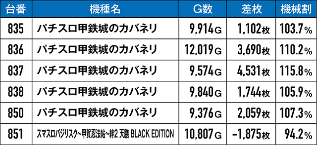 6台並びで優秀台挙動を見せていたこちら。851番台の『スマスロバジリスク~甲賀忍法帖~絆2 天膳 BLACK EDITION』のみマイナスになってしまったが、『パチスロ甲鉄城のカバネリ』の5台はいずれも+1,100枚超えを達成!