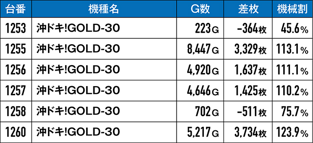 『沖ドキ!GOLD-30』コーナーでも並びっぽい光景を確認。総ゲーム数が少なすぎて微妙な結果で終わってしまった台もあるが、4,000G以上回されている台はしっかりプラスに。結果だけ見ても6台並びが濃厚ではないだろうか。