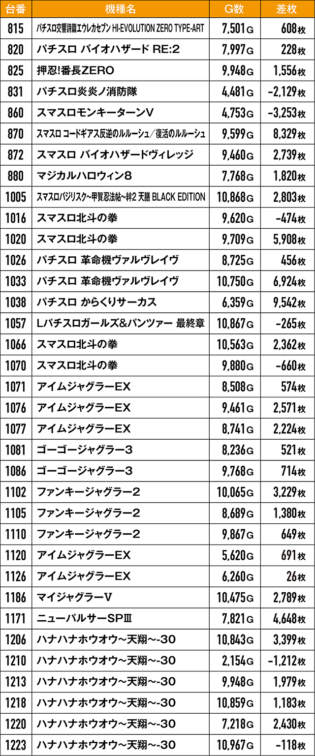 上では並びっぽい挙動を見せていた2箇所を紹介したが、それ以外にも単品で優秀な結果を残した台が多数あり。5,000枚超えレコードが生まれていたのは当然、8,000枚オーバー記録も2台!また今回も『ジャグラー』シリーズを筆頭に、Aタイプに優秀台が多く潜んでいた模様。