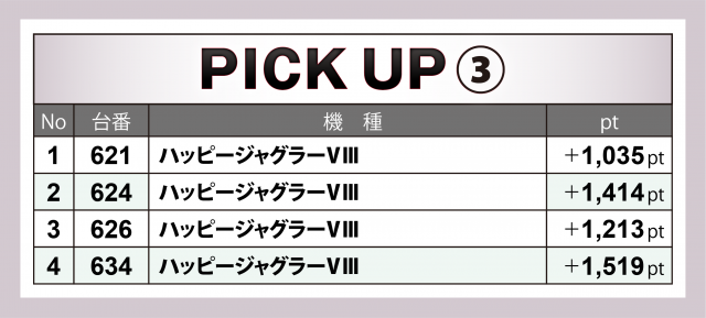 『ハッピージャグラーVⅢ』18台では全体の8割弱となる14台がプレイヤーの勝利と高水準となったが、4桁プラスを達成した4台は+2千の壁を超えられず、さらに突出した台があればなお良かった。