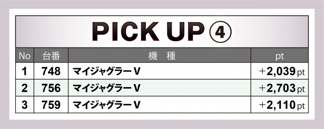 『マイジャグラーⅤ』18台は10台と全体の6割弱がプラスで、上表に掲げた3台がどれも+2千オーバーの差枚数を残した。