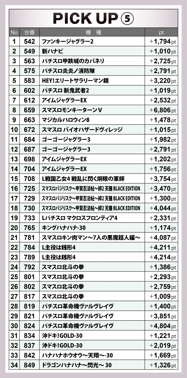 末尾6や好調マシン以外で1,000overに至ったのは表の34台。『スマスロモンキーターンⅤ』659番台による+6千8百超を代表格にスマスロ機には+4千オーバーがゴロゴロ。また、その他にもボーナスタイプ・6.5号機・沖スロとジャンルを問わず各台が素晴らしい成績をマークしており、店内のそこかしこに勝機が秘められていたことが窺える。