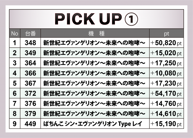 2機種合わせて9台がプラス5桁の差玉となったが、『エヴァ15』には+5万オーバーが2台と、この日最大の盛況を誇った。