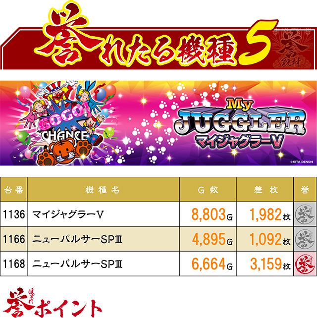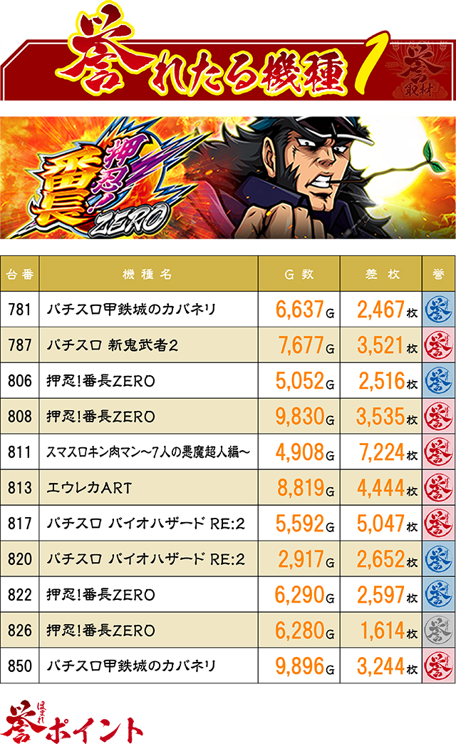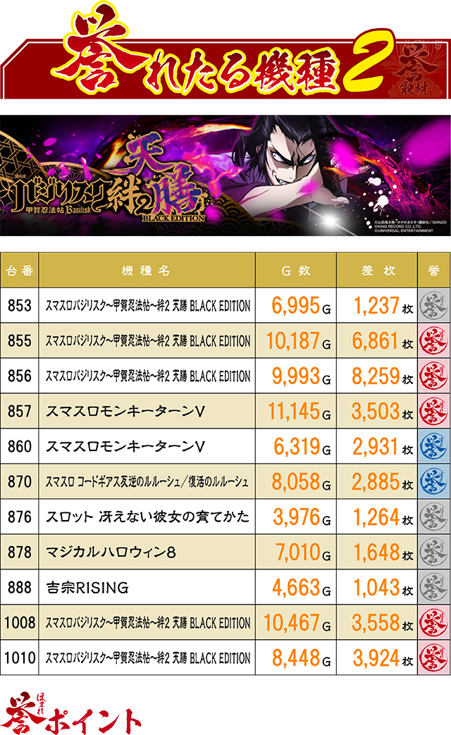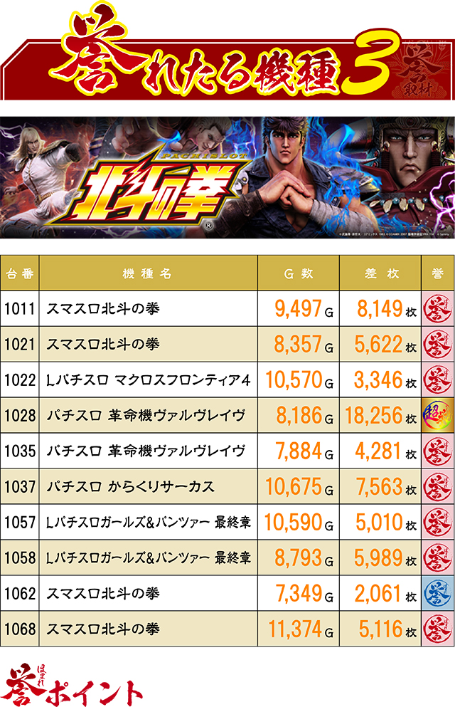 表内のほとんどの台が赤誉をマークした中で、頭5つ分くらい飛び抜けていたのは、18,256枚という化物記録の『パチスロ 革命機ヴァルヴレイヴ』。誉取材の名に相応しい結果だった。