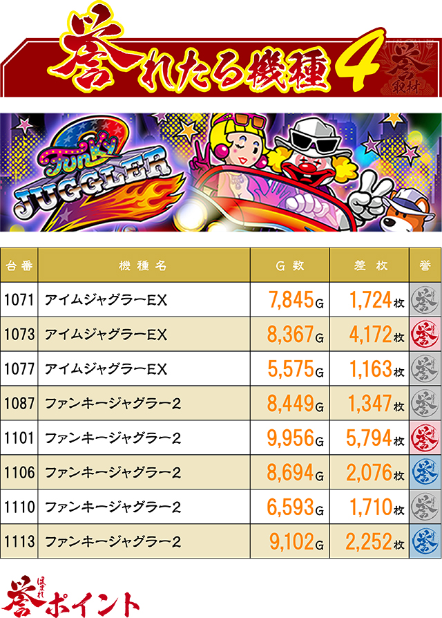 残念ながら赤誉は2台に落ち着いたが、『ジャグラー』シリーズ』のポテンシャルを踏まえれば妥当な結果。むしろ2台も赤誉が誕生した、と言うべきか。