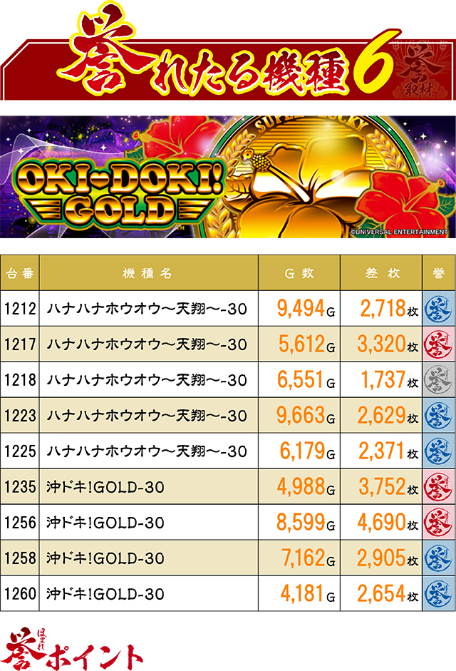 沖スロコーナーにも優秀台はたっぷり。それを物語るように、『ハナハナホウオウ~天翔~-30』と『沖ドキ!GOLD-30』から2,000枚超え記録が多発!