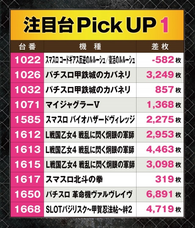 『パチスロ 革命機ヴァルヴレイヴ』は+6,891枚と大盛況!さらに『SLOTバジリスク~甲賀忍法帖~絆2』や『パチスロ甲鉄城のカバネリ』は3,000枚を超えており、注目を集めていた。