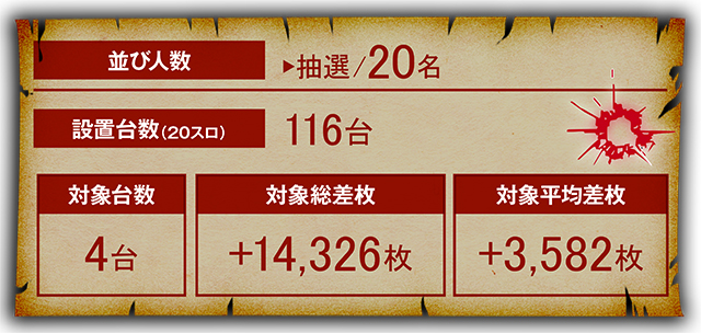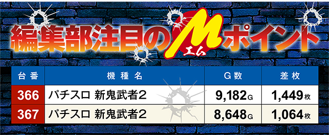 2日連続でのMスナイパーだったが、前日以上にMが真価を発揮したのではないだろうか。その証拠にM縛りの4台の平均は+3,582枚という信じがたい数値をマーク。Mの持つ意味を理解し、次なるMを予想できれば大勝利は目の前だ。