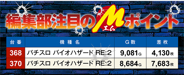 エンターライズと同じ系列のアデリオンから発売された『パチスロ バイオハザード RE:2』は、さらに勢いに拍車がかかっていた様子。なんと2台ともが+4,000枚オーバーを果たし、370番台に至っては7,600枚超え!