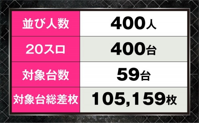 今回は朝から20スロの設置台数と同じく、400人ものファンが列を作った。