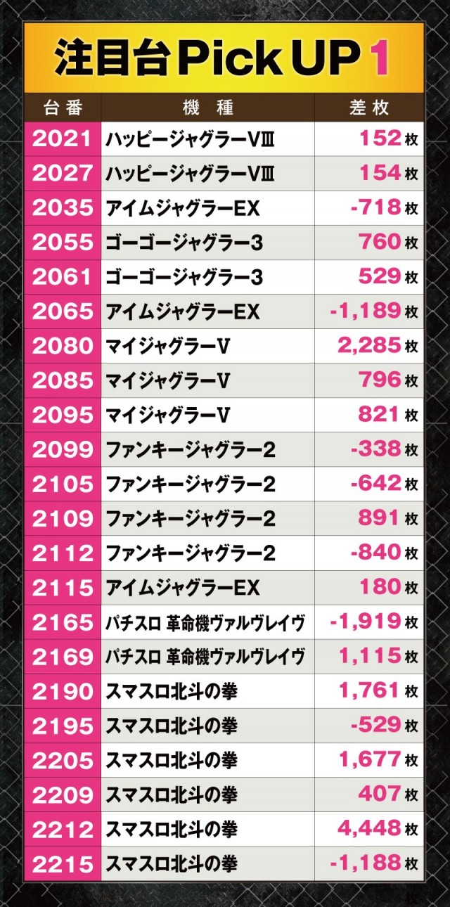 ジャグラーシリーズからは14台もの好調台を確認!しかし回転数不足の台が多く、思うように伸びなかったことが悔やまれる。