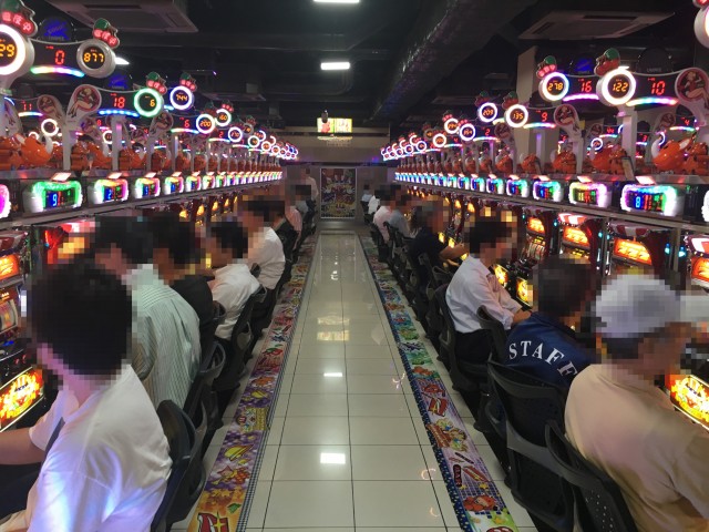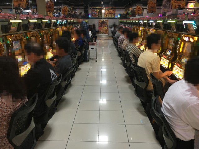 「アイムジャグラーAPEX」を中心としたジャグラーシリーズも人気で若者から年配者まで多くのプレイヤーで賑わっていた。まばゆい光を放つシマ一帯は明るく彩られていた。