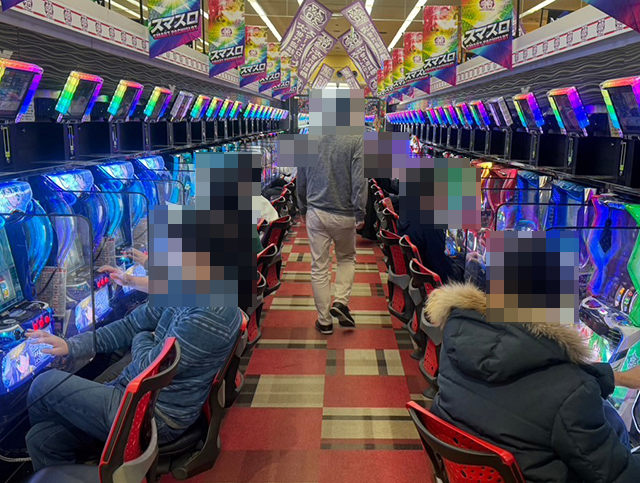 パチンコもパチスロも通路にゆとりがあり、のびのびと遊技をおこなえる空間となっている。